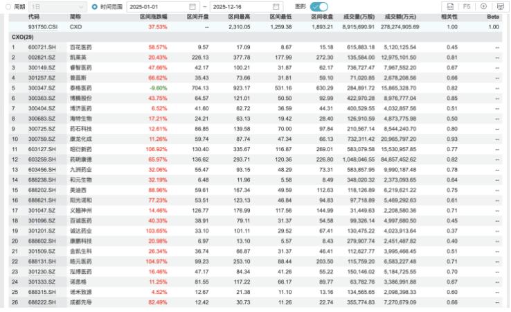 数据显示,2025年以来,在CXO指数(931750.CS)与CRO指数(8841421.WI)29只、23只成份股中, 泰格医药 (300347.SZ)是唯一录得下跌的企业,截至12月16日累计跌幅达9.60%,市值较高点蒸发逾1300亿元,目前已回落至400亿梯队。