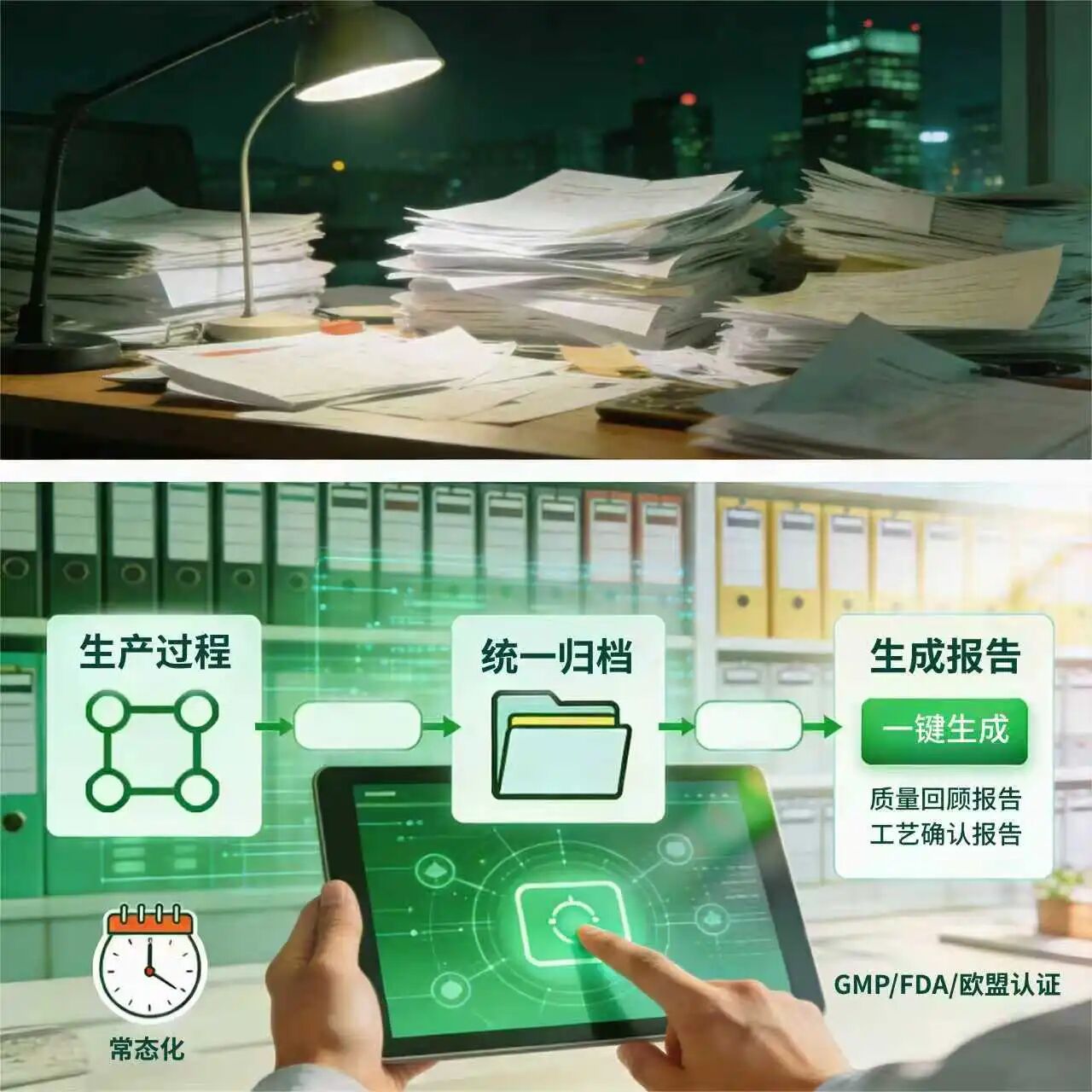 商业化生产企业最怕什么?不是产量跟不上,而是监管检查时翻遍堆积如山的纸质记录、Excel表格,却找不到关键数据;不是不想做质量回顾,而是几十人耗时半个月整理生产、检验数据,图表黏贴,最终报告仍可能因人工计算误差被质疑。