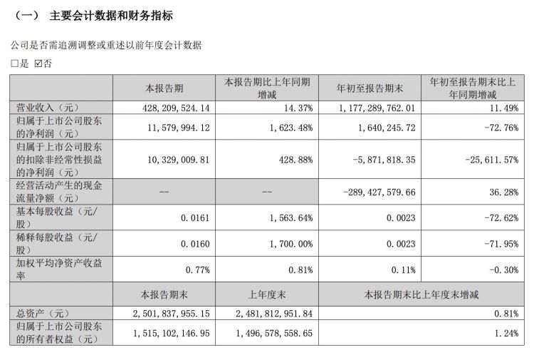 根据长亮科技2023年三季报,前三季度营收约11.77亿元,同比增加11.49%;归属于上市公司股东的净利润约164万元,同比减少72.76%。其中,第三季度营收约4.28亿元,同比增加14.37%;归属于上市公司股东的净利润约11158万元,同比增长1623.48%。