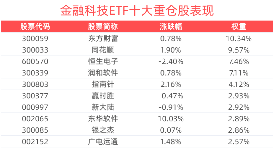 数据显示,截至2025年1月27日,中证金融科技主题指数(930986)前十大权重股分别为同花顺(300033)、东方财富(300059)、恒生电子(600570)、润和软件(300339)、指南针(300803)、新大陆(000997)、银之杰(300085)、东华软件(002065)、赢时胜(300377)、广电运通(002152),前十大权重股合计占比53.21%。