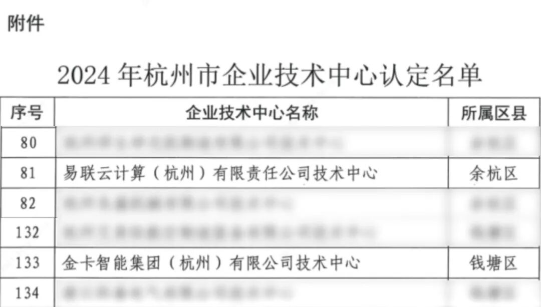 ●在杭州市经济和信息化局发布的2024年杭州市企业技术中心认定名单中,金卡智能集团(杭州)有限公司技术中心与易联云计算(杭州)有限责任公司技术中心均荣获认定。
