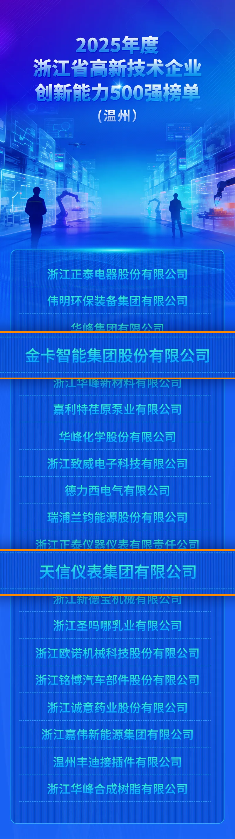 近日,2025年度浙江省高新技术企业创新能力500强榜单发布,金卡智能集团及天信仪表集团双双登榜。该榜单由省科技信息研究院、省工业和信息化研究院联合评选,聚焦“研发投入、人才队伍、知识产权、成果转化”等核心维度。此次入选,标志着企业的创新能力和行业领先地位再获省级权威认证。