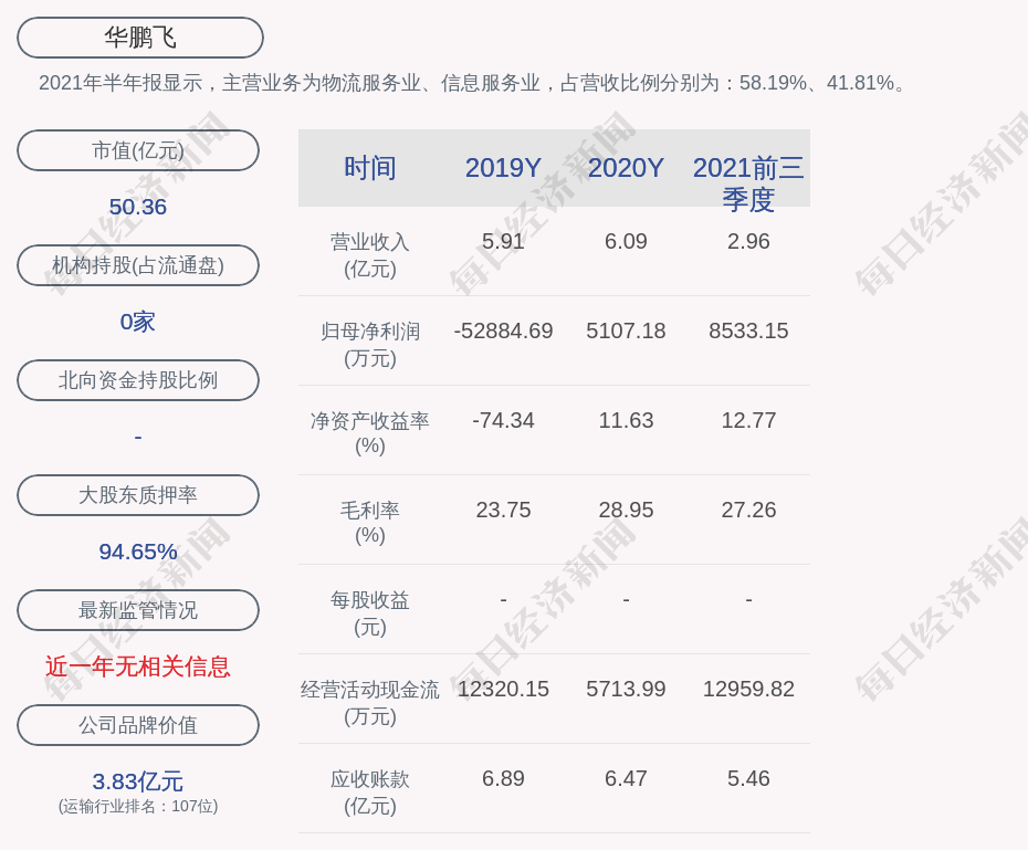 2021年半年报显示,华鹏飞的主营业务为物流服务业、信息服务业,占营收比例分别为:58.19%、41.81%。