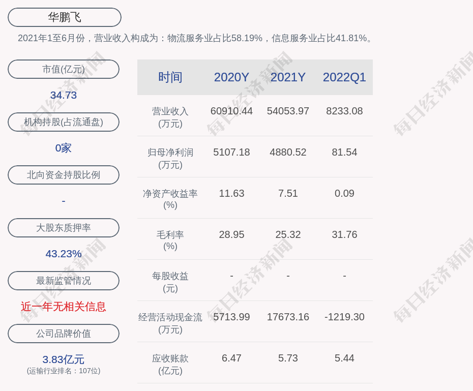 2021年1至6月份,华鹏飞的营业收入构成为:物流服务业占比58.19%,信息服务业占比41.81%。