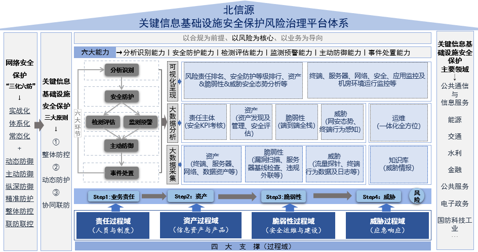 作为国家规划布局内的重点软件企业、国家关键信息基础设施安全保护核心承担单位之一,北信源深度参与关保、等保工作,受邀入驻国家等级保护2.0与可信计算3.0攻关示范基地。北信源将“三化六防”实战理念融入关保建设当中,以风险为核心构建北信源关键信息基础设施风险治理平台(简称:关基风险治理平台),小名“战舰”,又称“关保大脑”。定位为链接关保法规政策标准和关保人防技防综合防御措施之间的关保管理平台,为我国重点行业领域关基风险治理而生。全面覆盖网络空间安全的各个层面,通过有效性评估形成闭环管理,承担网络空间安全全面持续性改进,充分满足了新时代、新形势下“关基”单位风险治理的需求。