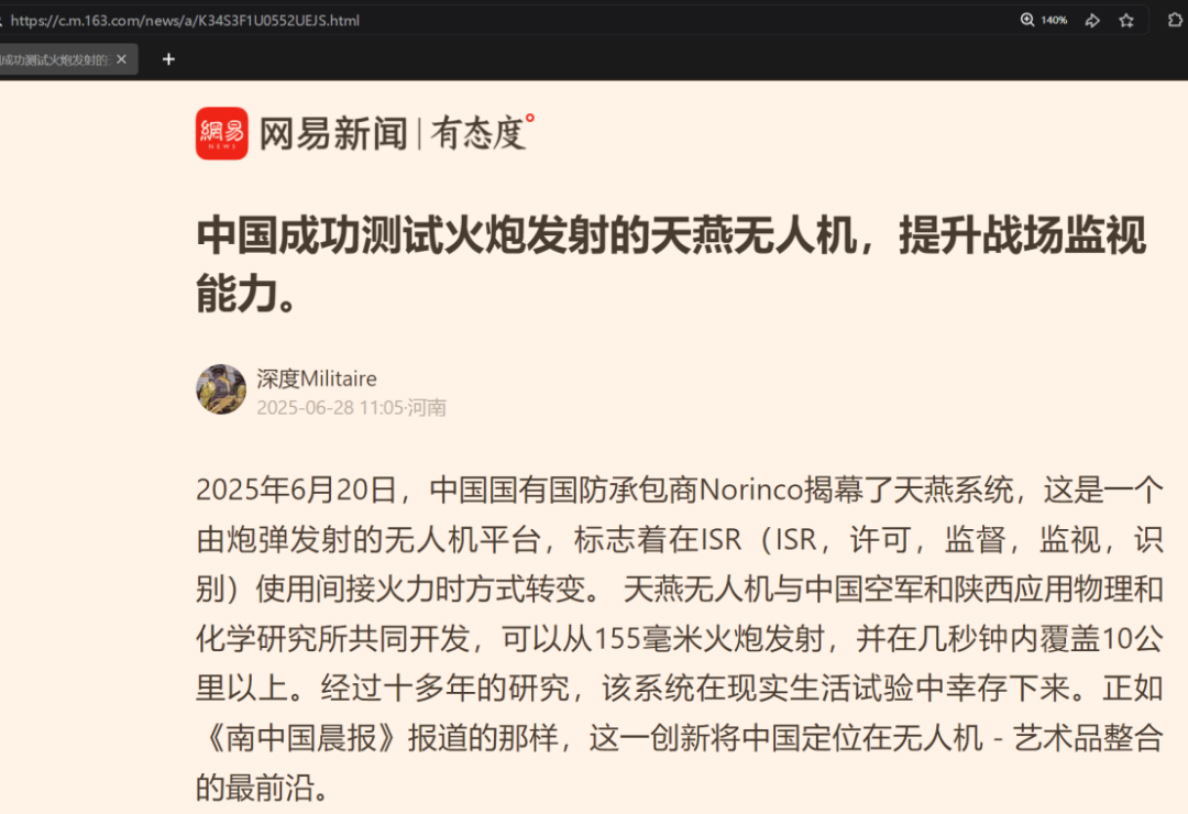 近日,媒体报道了一则关于中国新型炮射无人机系统取得突破性进展的消息。报道称:这是一种能够通过155毫米火炮发射的无人机,标志着中国在炮射飞行器技术领域实现了从概念到实用的重大跨越。该炮射无人机可在数秒内飞行超10公里,展现出即时侦察、快速引导和快速反应的革命性能力,为未来炮战规则的重塑奠定了基础。这项技术由“陕西应用物理化学研究所”等机构参与研发,成功将科幻构想转化为现实,彻底打破传统无人机因飞行速度慢而面临的一系列短板。