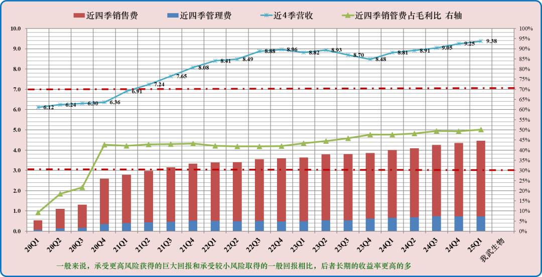 该指标用于分析公司商业模式内产生净利润能力的强弱。可关注近四季销售和管理费用与毛利润之比持续小于30%的公司,这样的公司具备较高的竞争优势(即图中绿线折线低于下红虚线为优异,靠近为优秀);若该指标处于30-70%之间(图中红色虚直线之间)为可接受区域;若大于70%需要警惕,说明该公司产生净利润的能力较弱。