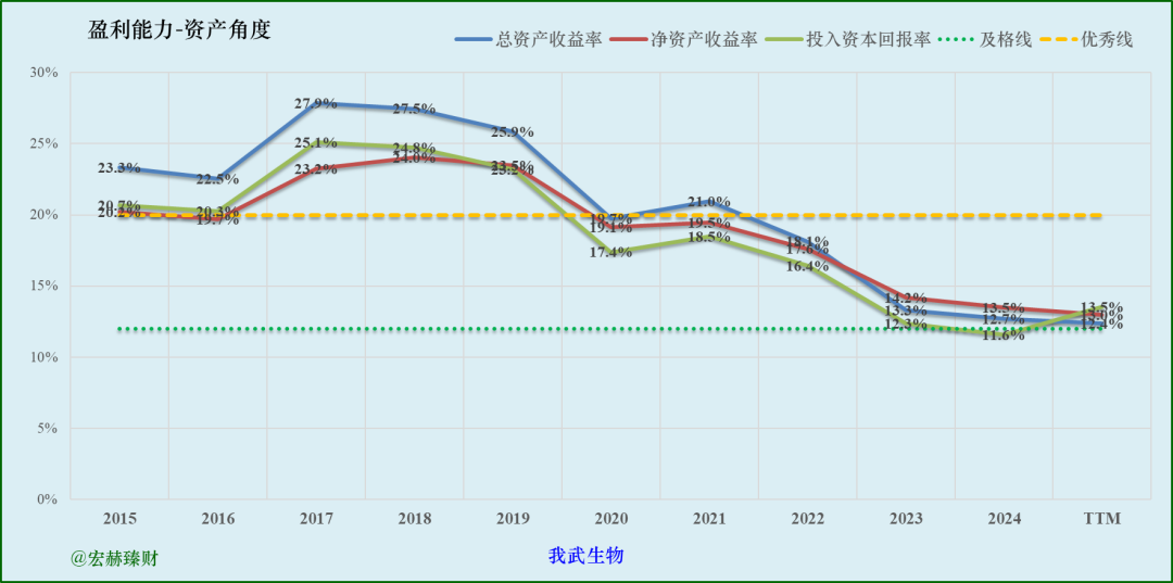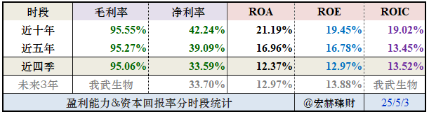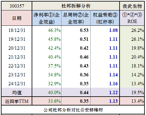 我武生物模式效益很高,效率走低(新产品规模化尚需时日),维持1.1倍左右杠杆,实现近七年ROE均值19.5%。