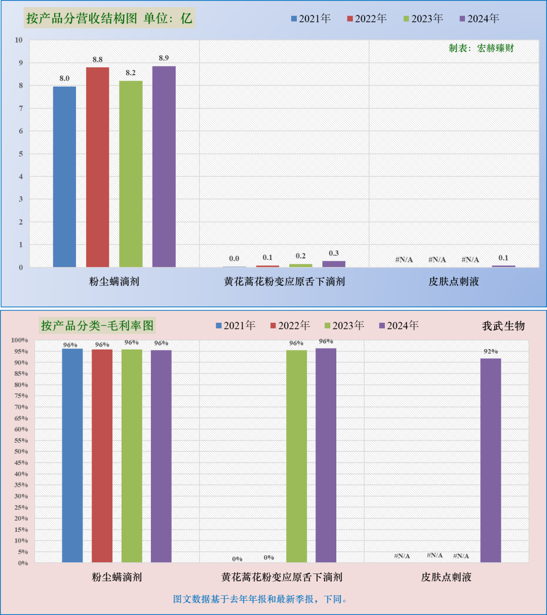 第一业务粉尘螨滴剂营收8.9亿,权重为96%,近三年同比增幅分别为:10%、-7%、8%;毛利率96%。