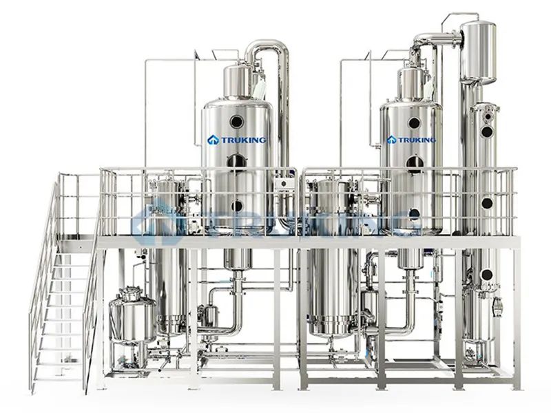 在封闭容器内的真空状态下,通过蒸汽对中药提取液进行加热蒸发浓缩,并利用机组的一效浓缩器在生产时产生的二次蒸汽供应二效浓缩器浓缩加热,使蒸汽得以二次利用,达到节能的目的。
