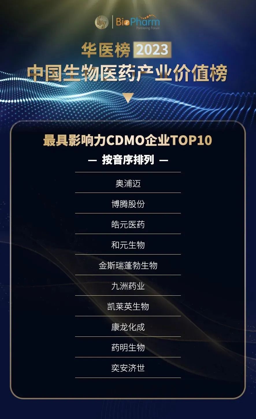 2023年6月29日,第九届中国生物医药创新合作大会(BIO-PHARM2023)暨2023中国生物医药产业价值榜颁奖盛典在苏州隆重举办。重庆博腾制药科技股份有限公司(以下简称“博腾股份”)荣登“最具影响力CDMO企业TOP10”榜单。