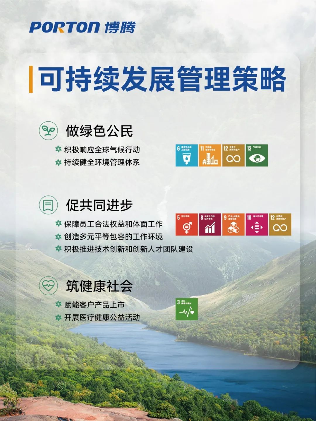 博腾股份致力于将可持续发展融入日常管理运营,秉持“做绿色公民、促共同进步、筑健康社会、优公司治理”的ESG理念,持续推进ESG管理提升,积极回应利益相关方关切,强化实质性议题及关键绩效管理,以自身行动支持联合国可持续发展目标(UN SDGs)的实现。