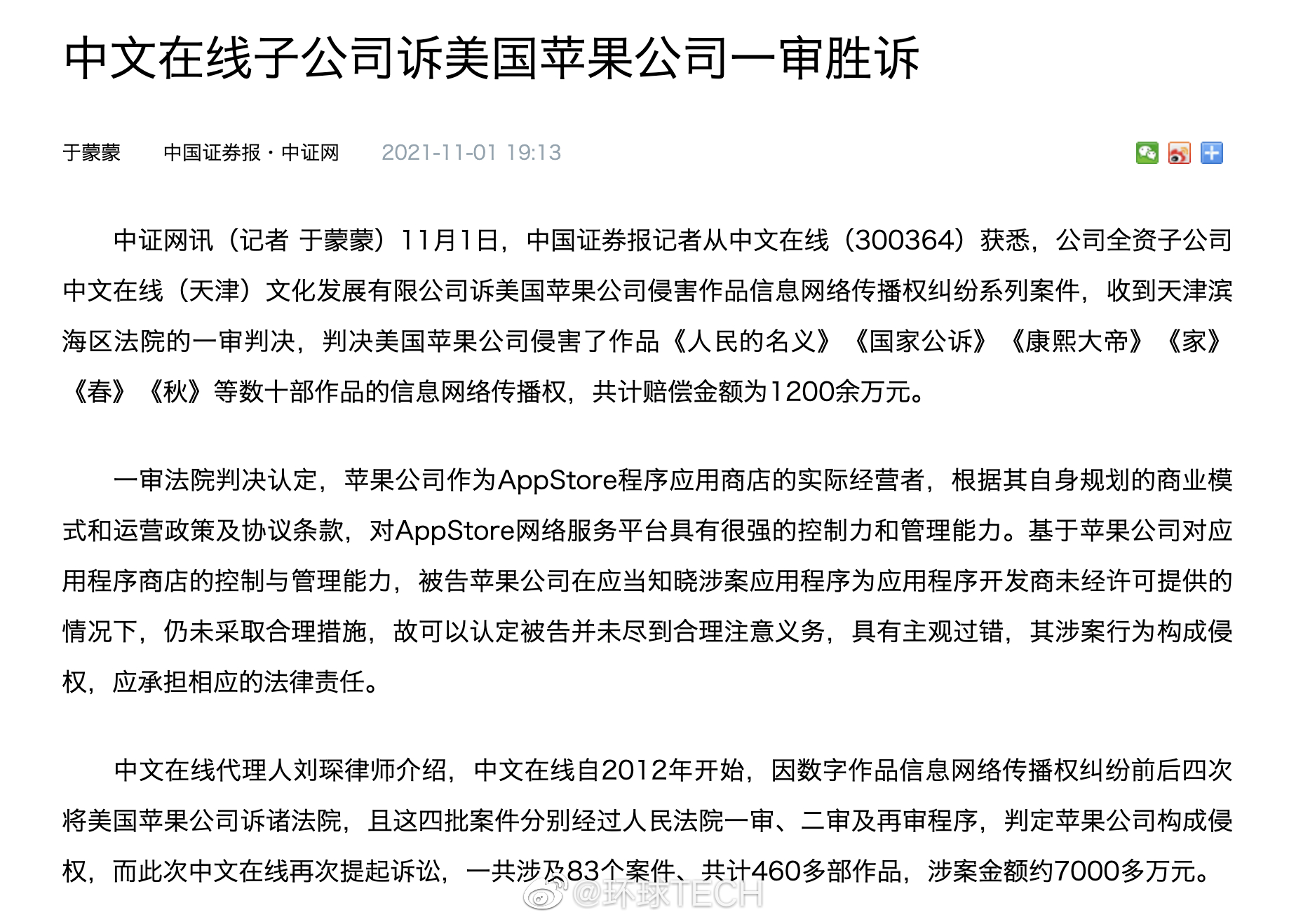 11月1日,记者从中文在线(300364)获悉,公司全资子公司中文在线(天津)文化发展有限公司诉美国苹果公司侵害作品信息网络传播权纠纷系列案件,收到天津滨海区法院的一审判决,判决美国苹果公司侵害了作品《人民的名义》《国家公诉》《康熙大帝》《家》《春》《秋》等数十部作品的信息网络传播权,共计赔偿金额为1200余万元。(中国证券报)