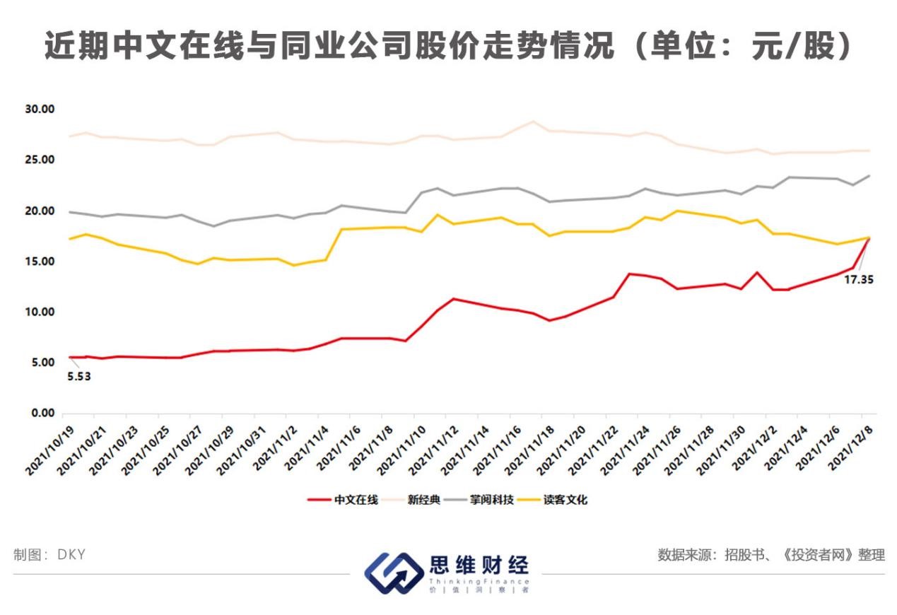 公司的股价也随即上涨,与掌阅科技(603533.SH)、新经典(603096.SZ)等同业公司相比,出现了较大偏离。11月12日,交易所针对中文在线的股价走势、深交所易互动上的回复以及公司股东的减持计划等问题,给中文在线发去了关注函。