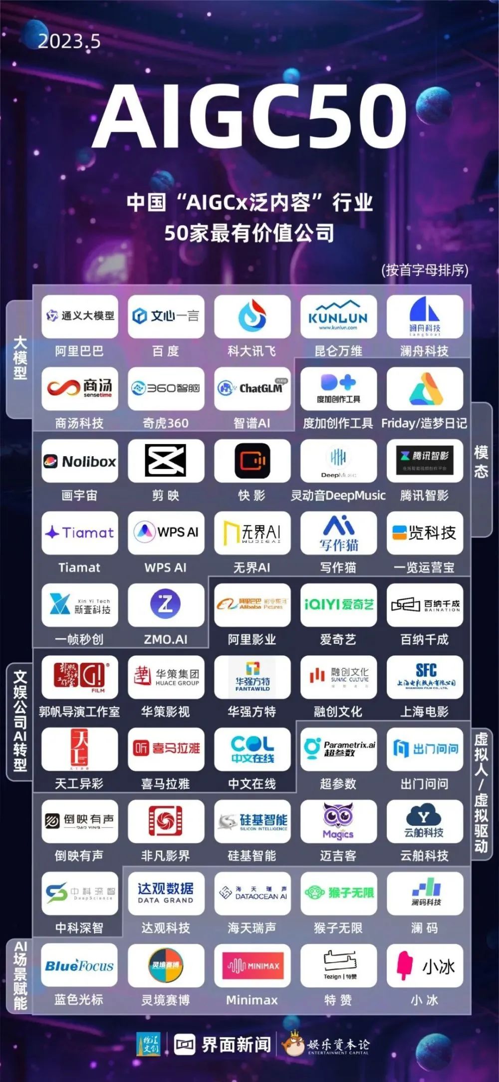 6月12日,在上海市徐汇区文化和旅游局指导下,界面新闻、娱乐资本论、上海市徐汇区文化旅游服务和发展中心,共同举办了“娱乐+AI ”主题活动——《AIGC 浪潮下的文娱科创新视野》暨“首届上海文娱科创沙龙”。该活动中正式发布“AIGC50”榜单,汇聚国内AIGC领域实力最强、最前沿的50家公司,中文在线集团凭借在AIGC领域的前瞻布局和落地实践,入围“AIGC50”榜单。