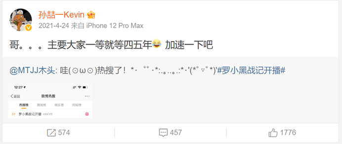 此外他也对“罗小黑”IP充满期待。在2021年《罗小黑战记》登上热搜时,孙喆一还转发了导演木头的微博催更,称“大家一等就等四五年,加速一下吧。”