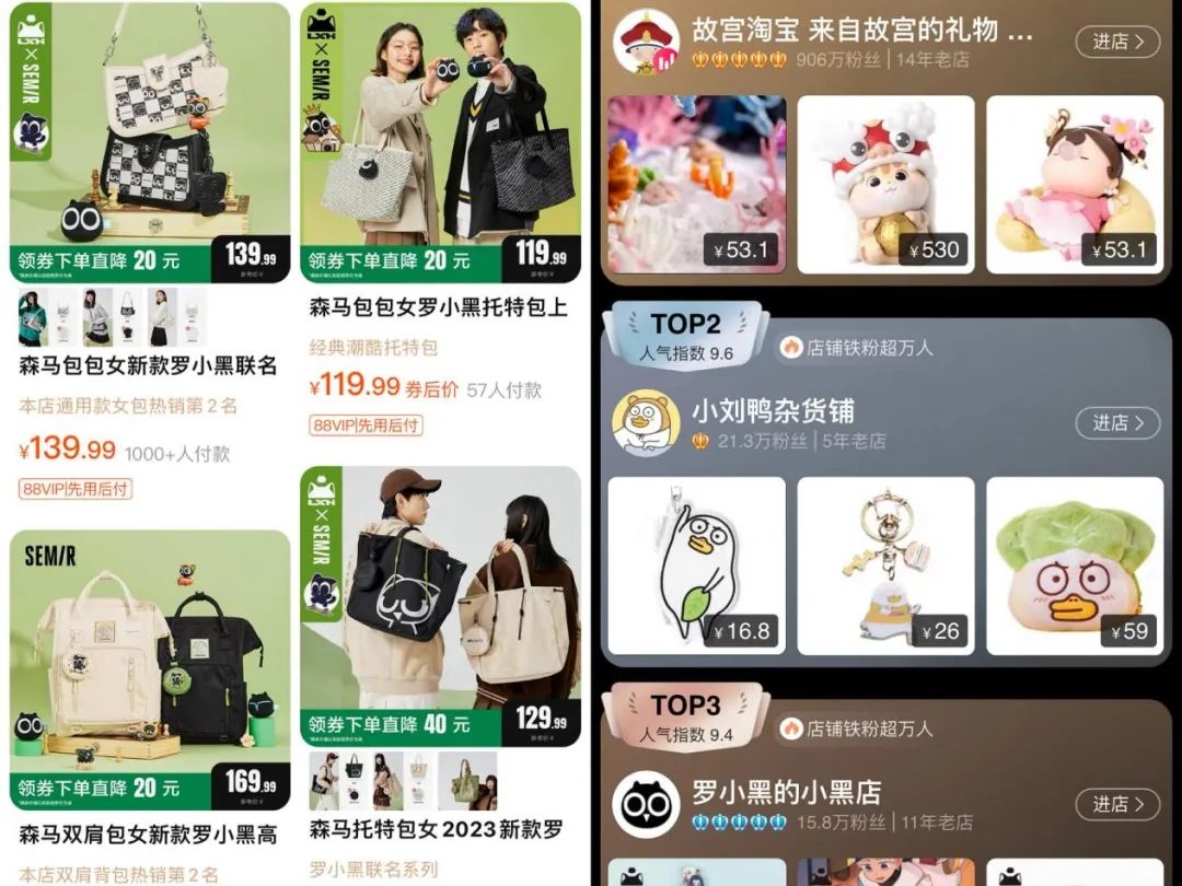 影视作品之外,对于市场变现,寒木春华也进行了更多探索,IP授权是主要的手段。“罗小黑”联名商品涵盖服饰、游戏、饮料、香水等多个品类,合作品牌包括森马、明日方舟、和平精英、康师傅等。在淘宝文创IP衍生店铺榜上,“罗小黑的小黑店”排名第三,仅次于故宫淘宝、小刘鸭杂货铺。