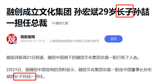 值得一提的是,交易方融创文化集团总裁由孙喆一担任。多家媒体确认其为融创集团董事长孙宏斌的长子。目前,融创官网上,孙喆一的职务已经更新为“融创集团执行董事、副总裁兼文化集团总裁”。
