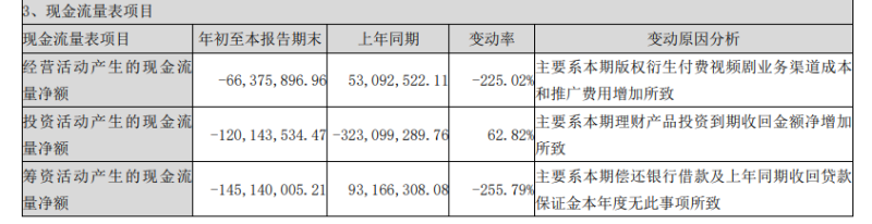现金方面,前三季度,公司经营活动产生现金净流出6638万元,投资活动产生现金净流出1.2亿元,筹资活动产生现金净流出1.45亿元。对于经营活动带来的现金流出,公司称主要系版权衍生付费视频剧业务渠道成本和推广费用增加所致。截至2023年9月30日,中文在线的现金及现金等价物为1.62亿元,和期初的2.37亿元相比有所减少。
