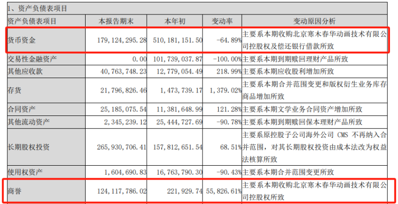 财报提到,截至2023年9月30日,公司的货币资金为1.79亿元,和年初的5.1亿元相比大幅减少。对此,中文在线称主要是期内收购北京寒木春华动画技术有限公司控股权及偿还银行借款所致。此外,收购寒木春华控股权还让公司商誉由期初的22万元猛涨至期末的1.24亿元。