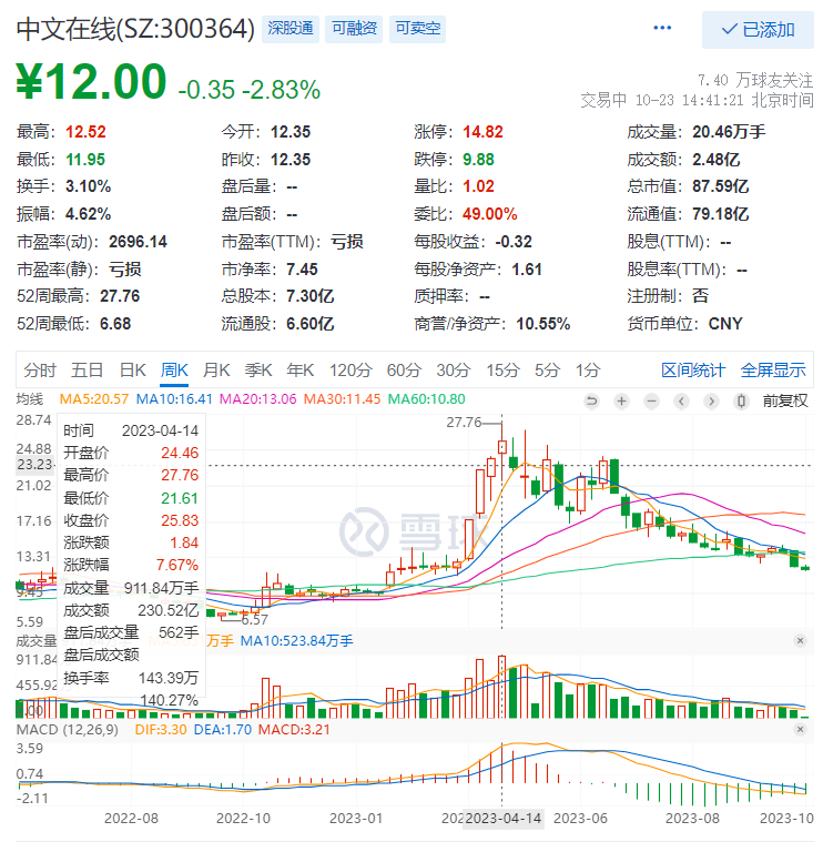 然而,头部动漫IP、扭亏为盈的业绩、大模型产品,似乎都未能帮助中文在线修复股价。今年4月以来。公司股价一路震荡下行。截至2023年10月23日14时41分,中文在线报收12元/股,跌幅为2.83%。和4月最高价27.76元相比已经跌去57%。