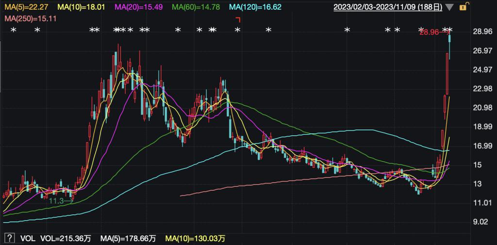 昨日盘后,公司发布公告称,11 月 7 日、8 日,中文在线连续 2 个交易日收盘价涨幅累计偏离值达到 42.31%。同时,公司股票于 10 月 31 日至 11 月 8 日连续 7 个交易日收盘价涨幅累计偏离值达到 103.69%,属于股票交易严重异常波动。11 月 9 日,中文在线继续高开,盘中达到 28.96 元高点,截至收盘报 27.97 元。