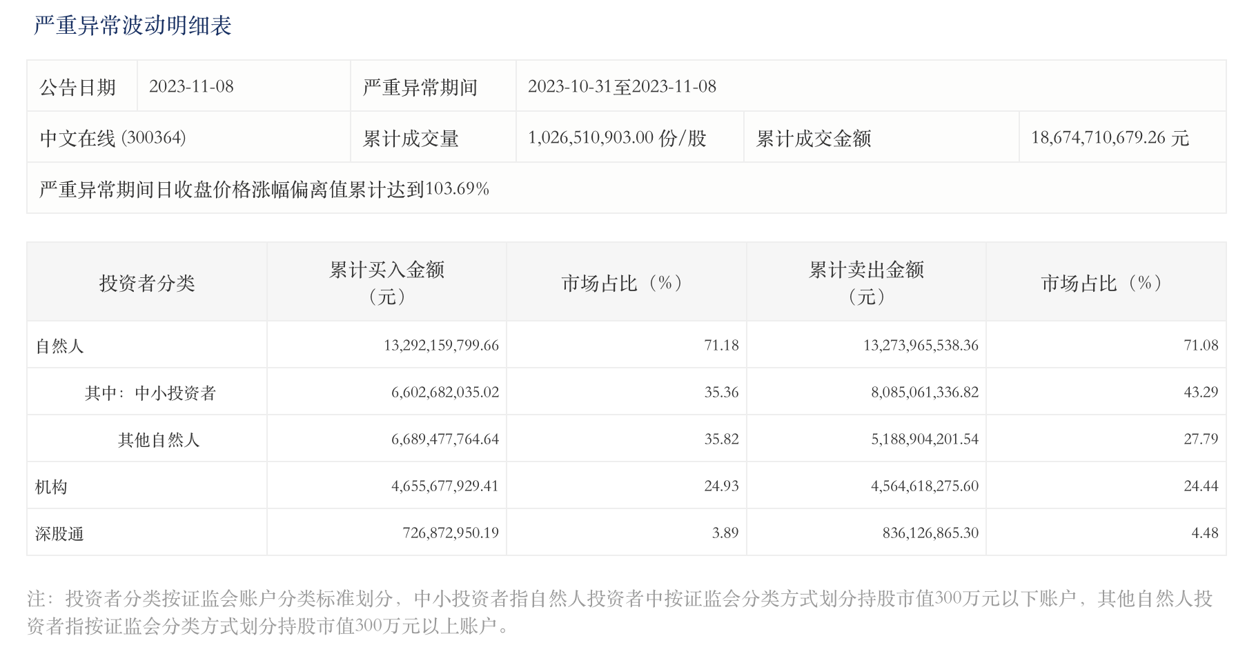 界面新闻注意到,中文在线的大涨,也构成了严重异常波动,从交易所披露的情况来看。10月31日至11月8日,自然人累计买入金额132.92亿元,市场占比71.18%,累计卖出金额132.74亿元,市场占比71.08%;而机构方面累计买入金额46.56亿元,市场占比24.93%,累计卖出金额45.65亿元,市场占比为24.44%。机构自然人的参与度不足“37开”。