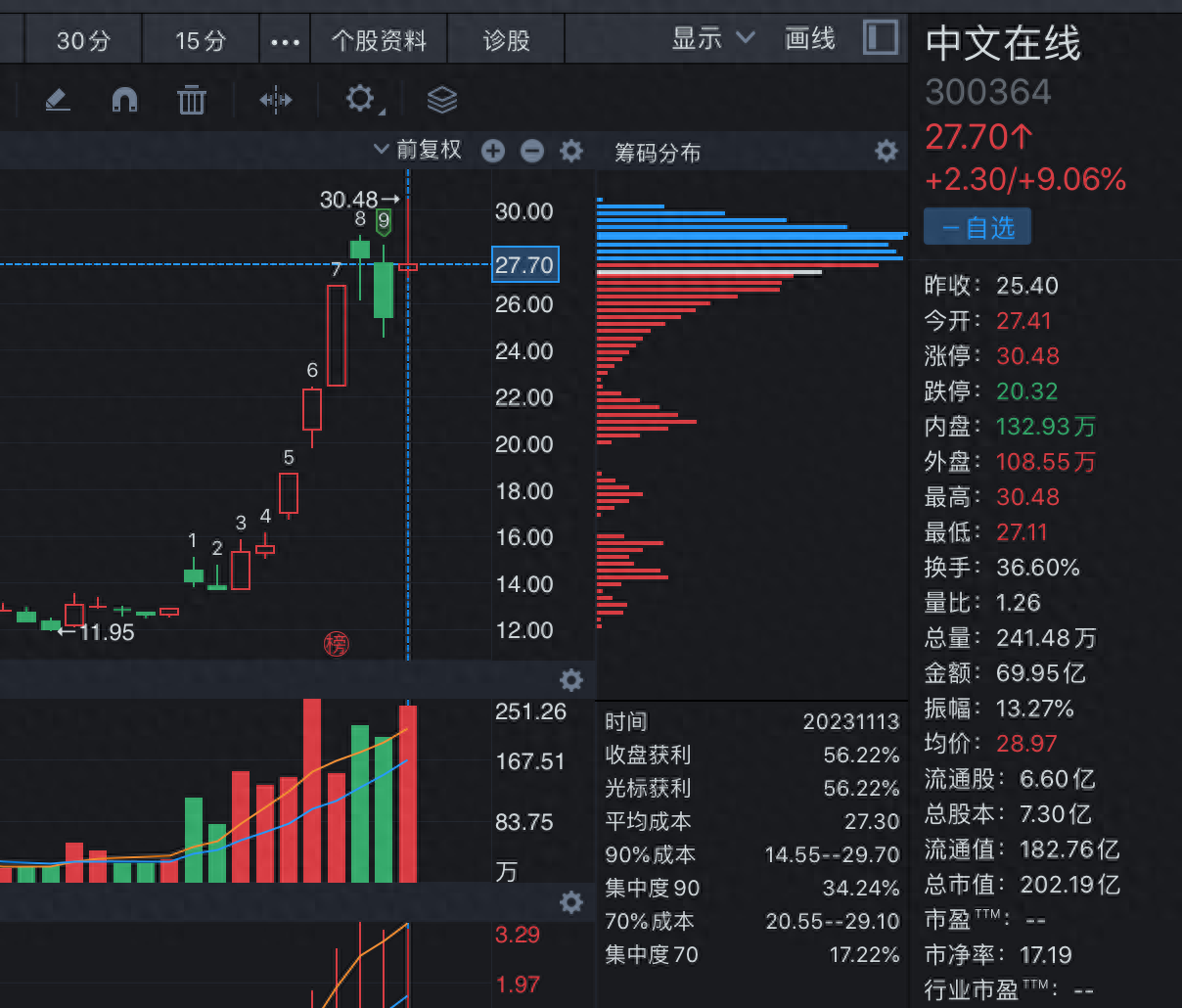 需要指出的是,自10月31日算起,中文在线的累计涨幅已经翻倍,达到了114.4%,区间振幅更是有129.72%,区间换手率达到254.91%。据同花顺软件,市场筹码的平均成本为27.3元。这也是中文在线年内第二次“作妖”。