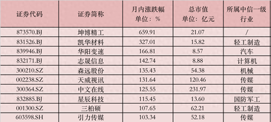 截至11月23日收盘,数据显示, 55只个股月内涨幅超50%,其中,10只个股涨幅超100%。从市值来看,多为中小市值个股。板块方面,以上个股集中于TMT板块。