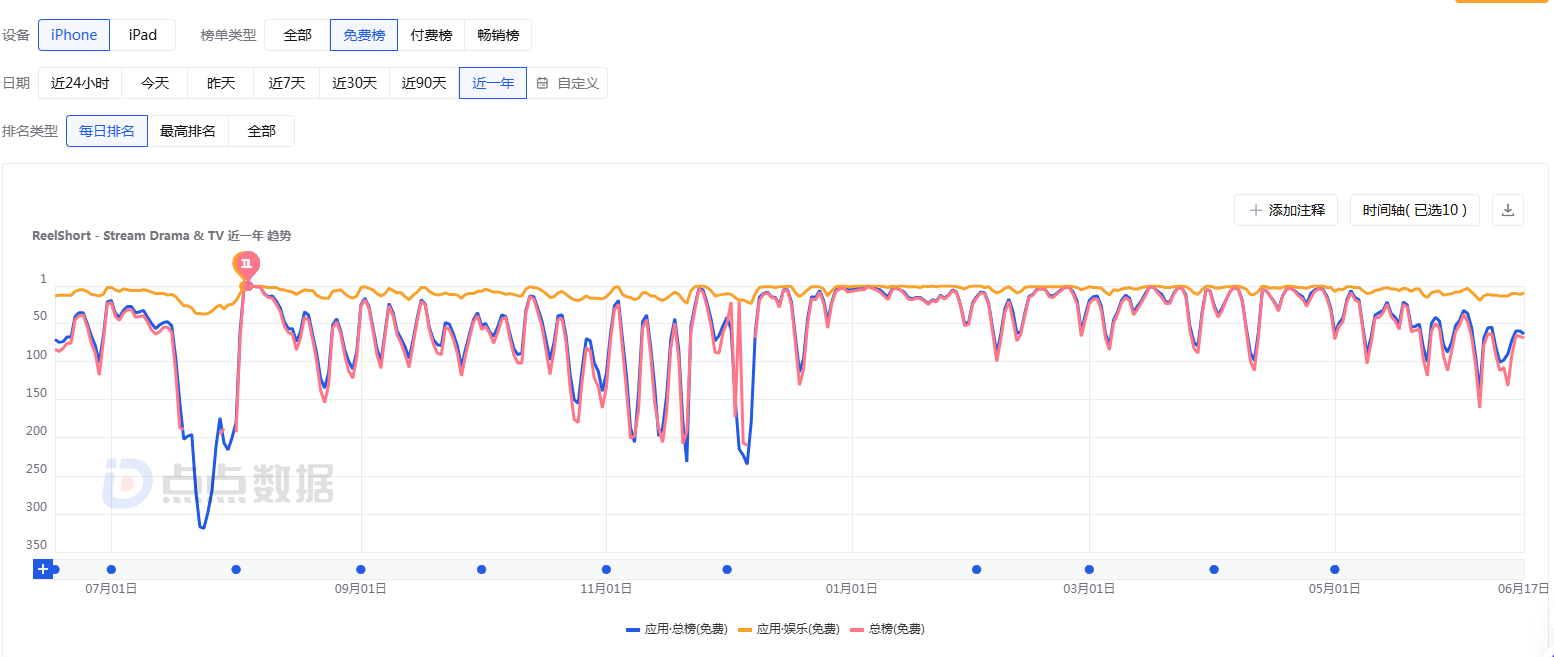 根据全球移动应用、游戏数据监测服务商点点数据的监测,ReelShort过去一年在美国App Store平台的娱乐应用免费榜排名始终保持在前40名,近期则保持在前20名。
