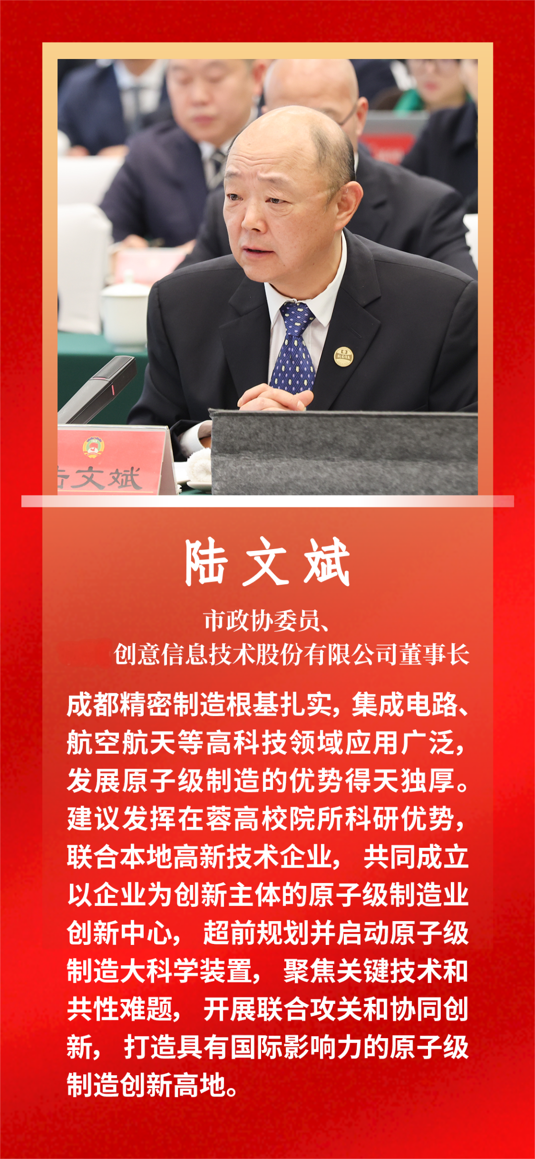 市政协委员、创意信息技术股份有限公司董事长陆文斌参加会议并作发言。他表示,成都精密制造根基扎实,集成电路、航空航天等高科技领域应用广泛,发展原子级制造的优势得天独厚。在此基础上,陆文斌董事长建议发挥在蓉高校院所科研优势,联合本地高新技术企业,共同成立以企业为创新主体的原子级制造业创新中心,超前规划并启动原子级制造大科学装置,聚焦关键技术和共性难题,开展联合攻关和协同创新,打造具有国际影响力的原子级制造创新高地。同时,应构建完善的产业生态,整合优势资源,组建产业联盟,建设产业园区,吸引企业集聚,打造完整产业链。扶持具有核心竞争力的企业,发挥龙头企业引领作用,壮大产业集群,为成都制造业高质量发展注入新动力。