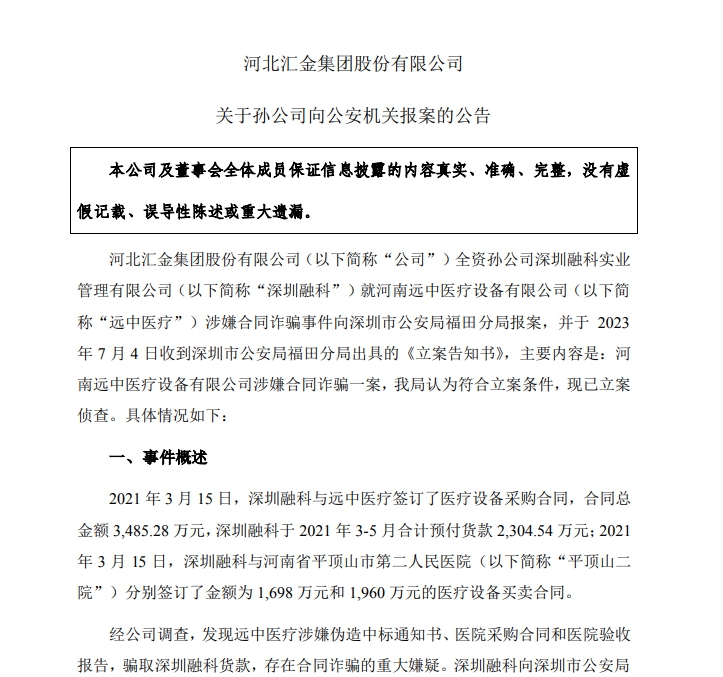 汇金股份披露,经公司调查,发现远中医疗涉嫌伪造中标通知书、医院采购合同和医院验收报告,骗取深圳融科货款,存在合同诈骗的重大嫌疑。