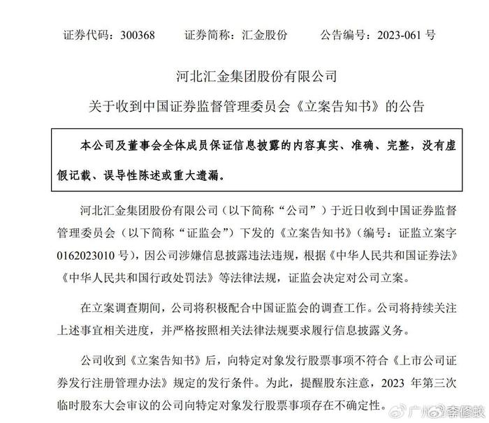 7月28日晚间,汇金股份发布公告称,因涉嫌信息披露违法违规,被证监会立案调查。早在去年8月17日,汇金股份就收到了邯郸市永年区监察委员会出具的《留置通知书》,时任公司总经理郭俊凯因涉嫌贪污罪被留置调查。但是该公司没有及时披露董事、高级管理人员因涉嫌违法违规被有权机关调查、采取强制措施的情况,直至2023年6月15日才在《关于深圳证券交易所2022年年报问询函回复的公告》中进行披露。
