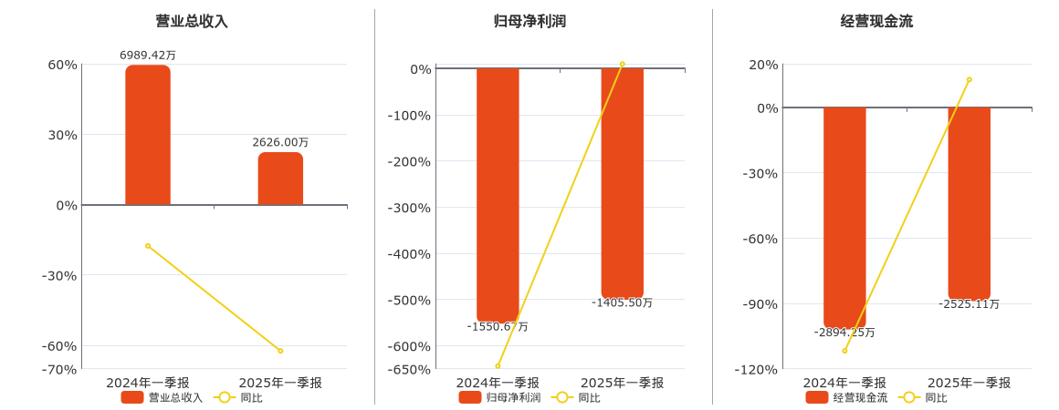 公司营业总收入为2626.00万元。归母净利润为-1405.50万元,较去年同报告期归母净利润增加145.17万元。经营活动现金净流入为-2525.11万元,较去年同报告期经营活动现金净流入增加369.15万元。