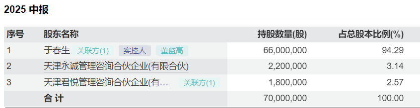 截至2025年6月末,库珀新能股东结构简单,于春生、天津永诚管理咨询合伙企业(有限合伙)、天津君悦管理咨询合伙企业(有限合伙)分别持股94.29%、3.14%和2.57%。