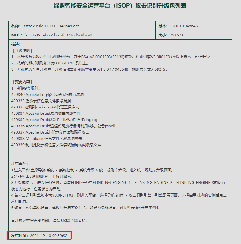 2021-12-10 09:59绿盟科技 ISOP平台发布标品攻击识别包,绿盟科技MDR服务团队开启用户侧平台规则包升级工作,实现平台规则检测能力再升级。