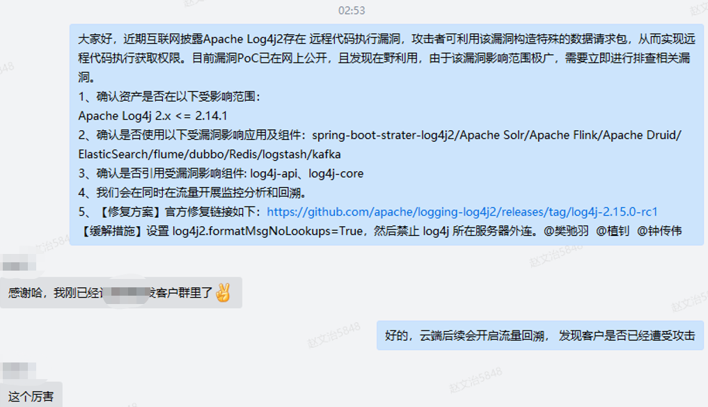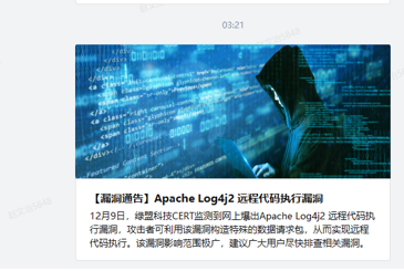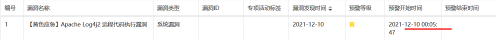 2021-12-10 00:05 ?MDR服务交付团队给用户发出“Apache Log4j2 远程代码执行漏洞”邮件预警,同步漏洞描述、漏洞影响及规避方案。