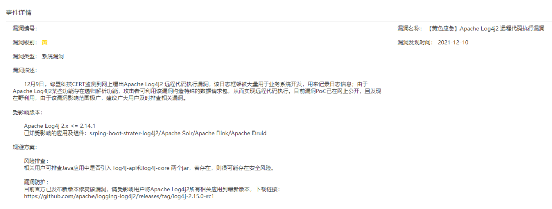 2021-12-09 23:57绿盟科技内部应急管理及决策团队,根据漏洞影响确定启动黄色应急。