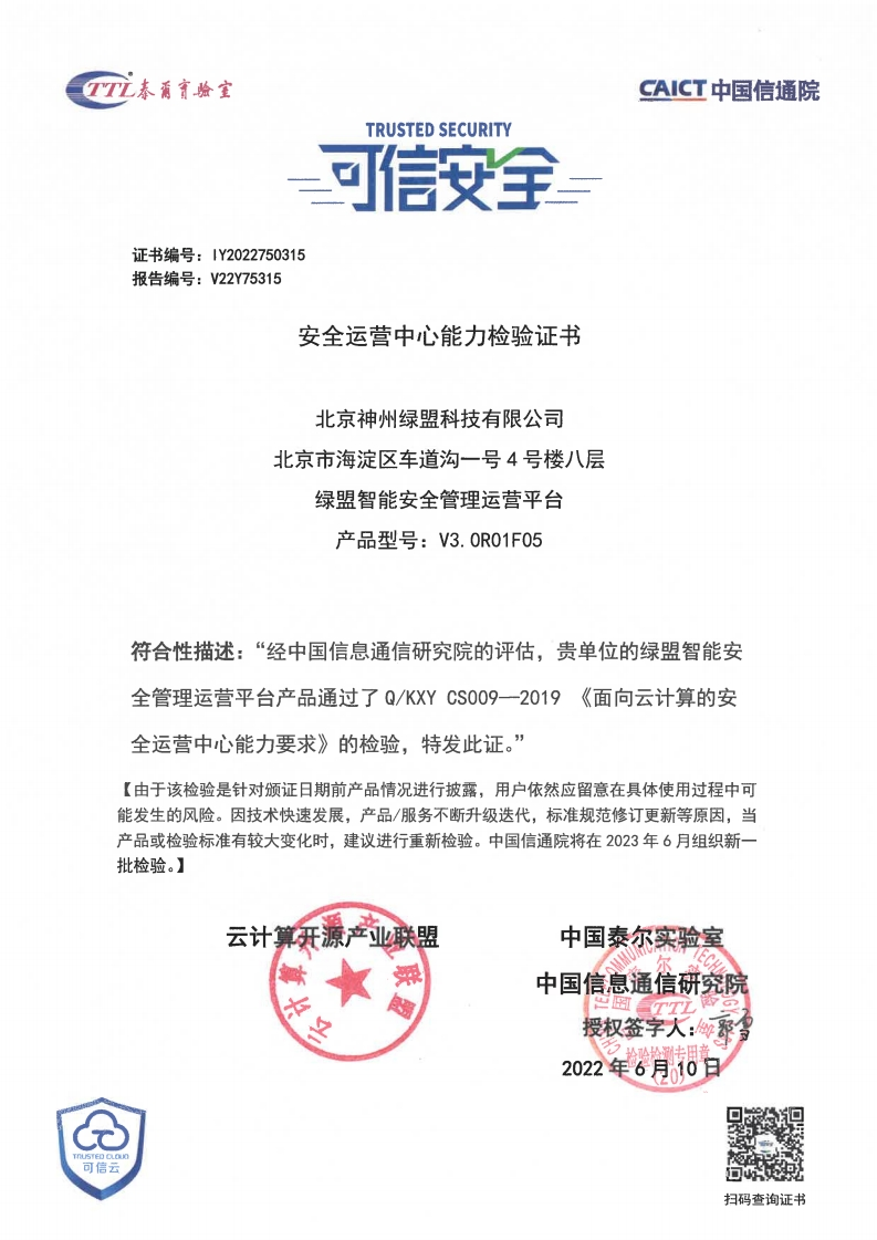 6月10日,绿盟智能安全管理运营平台顺利通过中国信息通信研究院《面向云计算的安全运营中心能力要求》评估,获得可信安全—安全运营中心能力检验证书。