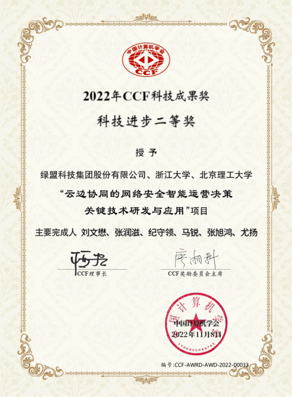 近日,中国计算机协会(CCF)公示了2022年度科技成果奖获奖名单。经CCF评审,绿盟科技联合浙江大学、北京理工大学共同申报的“云边协同的网络安全智能运营决策关键技术研发与应用”项目荣获科技进步二等奖。