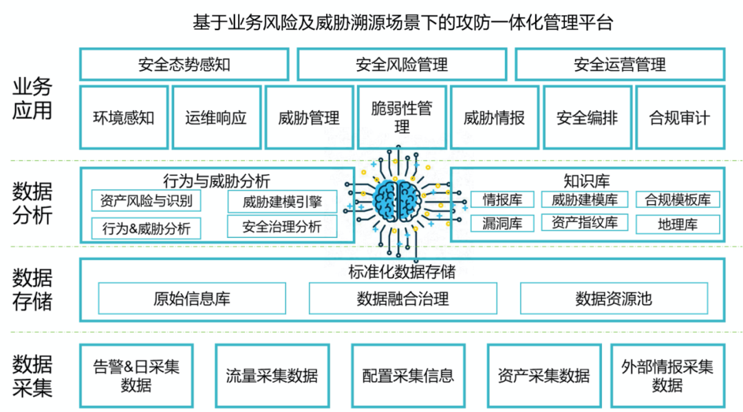 基于业务风险及威胁溯源场景下的新型一体化攻防平台整体分为五大功能:态势展示、数据采集处理、资产管理、情报预警、威胁溯源。