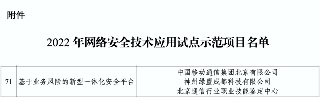 近日,工业和信息化部等十二部门联合公布了2022年网络安全技术应用试点示范项目名单,由北京移动牵头,绿盟科技、北京通信行业职业技能鉴定中心联合申报的“基于业务风险的新型一体化安全平台”成功入选。