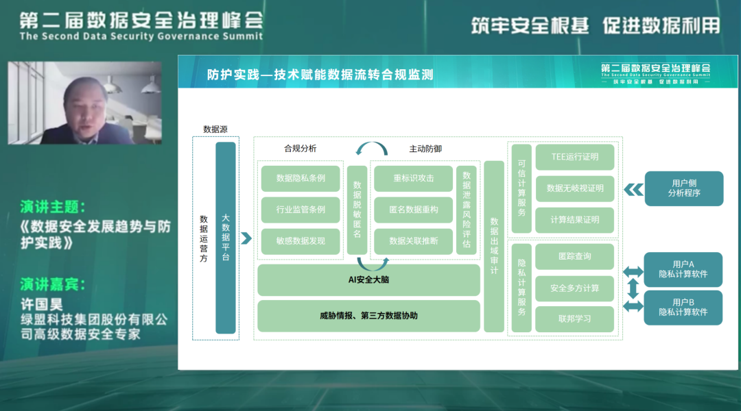 1月5日,第二届数据安全治理峰会在线上成功举办。峰会以“筑牢安全根基促进数据利用”为主题,由中国信息通信研究院、中国通信标准化协会指导,中国通信标准化协会大数据技术标准推进委员会(下文简称“CCSA TC601”)主办,数据安全推进计划(以下简称“DSI”)承办。绿盟科技受邀参会并发表《数据安全发展趋势与防护实践》的主题演讲。