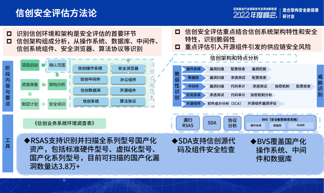 1月12-13日,由中国证监会科技监管局、上海市经济和信息化委员会和上交所理事会科技发展委员会指导,证券基金行业信息技术应用创新联盟(以下简称信创联盟)主办的2022年度峰会成功举办。其中,由信创联盟WG9信息安全工作组组长单位申万宏源证券有限公司和副组长单位海通证券股份有限公司、中银国际证券股份有限公司联合承办的混合架构安全新探索专题研讨会于13日上午线上召开。作为证券基金行业信息技术应用创新联盟及WG9信息安全工作组成员单位,绿盟科技出席会议,绿盟科技集团副总裁曹嘉在会上发表《信创安全评估方法与实践探讨》主题演讲。