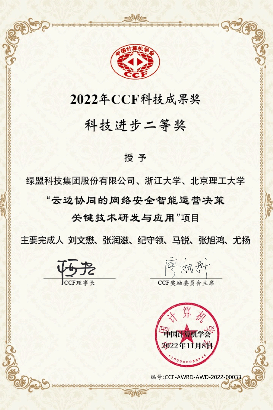 近日,2022年度“CCF科技成果奖”颁奖典礼在北京举行,绿盟科技凭借其与浙江大学、北京理工大学联合申报的“云边协同的网络安全智能运营决策关键技术研发与应用”项目荣获科技进步二等奖。作为该项目的主要负责人之一,绿盟科技集团首席创新官刘文懋博士代表领奖。