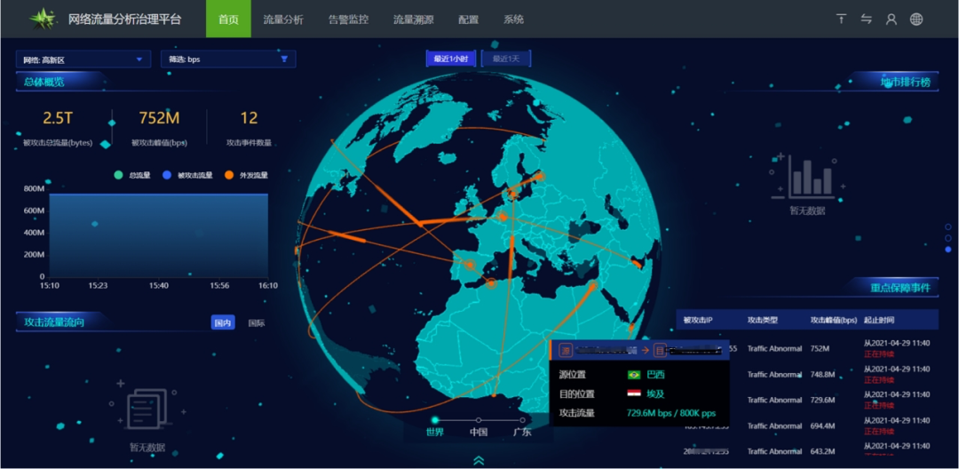在数据爆炸的时代,要满足客户日益增长的网络分析需求、实时性可视化要求,绿盟科技开发了绿盟网络流量分析治理和溯源平台(NSFOCUS MagicFlow),以异常流量分析、威胁检测、流量流向、应用流量分析、攻击溯源、可视化呈现作为核心功能,借助大数据收集、威胁情报和机器学习等技术,提供全网络可视化分析,联动NTA设备,可实现检测和分析的一体化完整方案。针对目前NAV客户所关注的攻击流向透视功能,MF平台可实现外网攻击、本网攻击、外省攻击、本身攻击、国际攻击等多种流向维度的可视化分析。在攻击研判、溯源的重点需求上,MF平台内置拓扑配置的能力,可在拓扑图中标注路由器名称和接口名称,支持查看各接口信息和流量,实现攻击路径的可视化溯源分析,为客户的网络优化和溯源提供帮助。