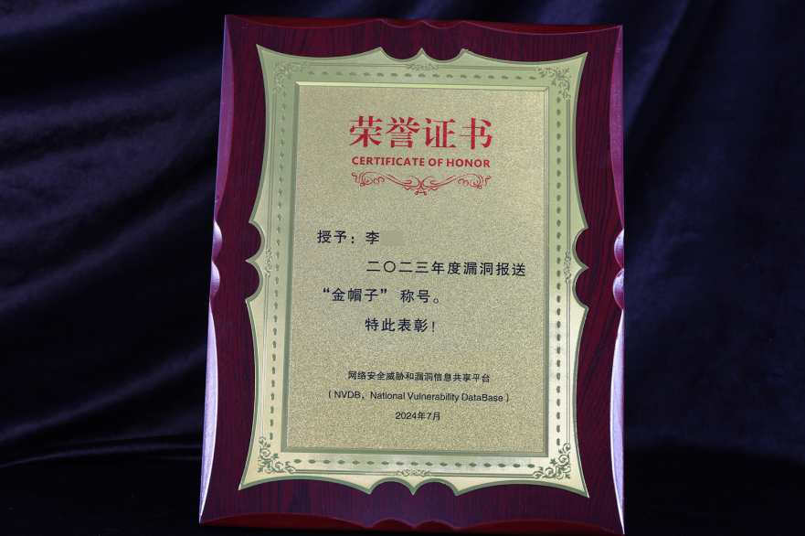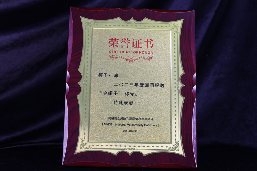 绿盟科技格物实验室安全研究员被授予2023年度漏洞报送“金帽子”称号