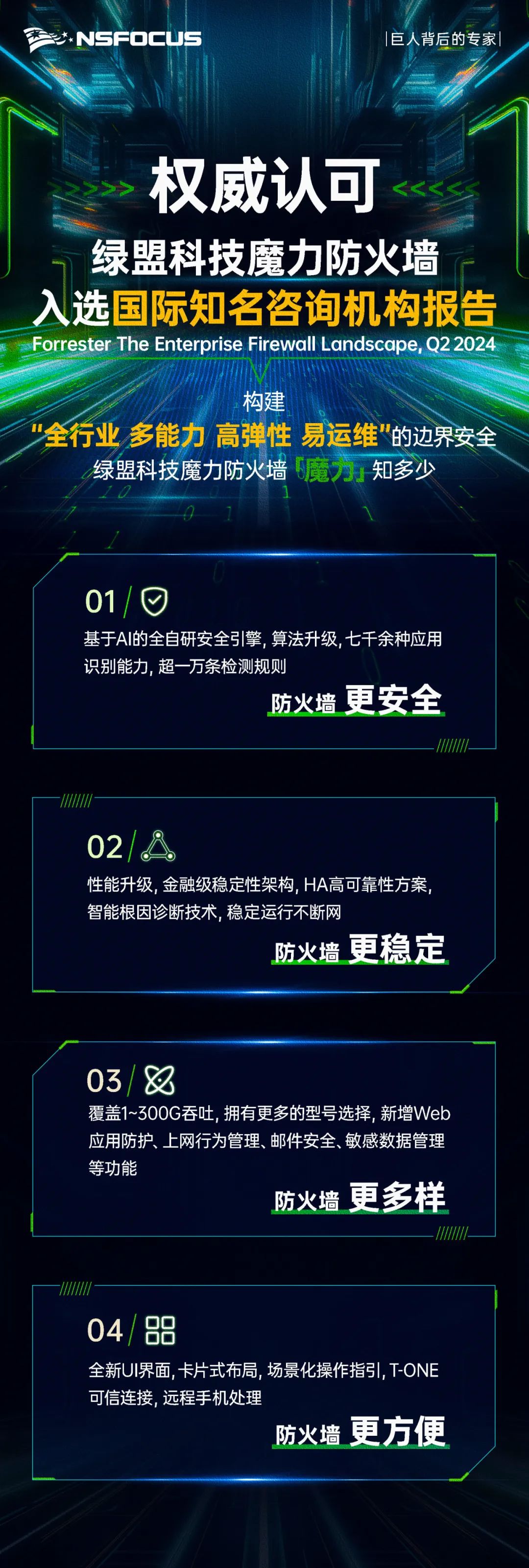 近日,绿盟科技魔力防火墙成功入选Forrester The Enterprise Firewall Landscape, Q2 2024报告。