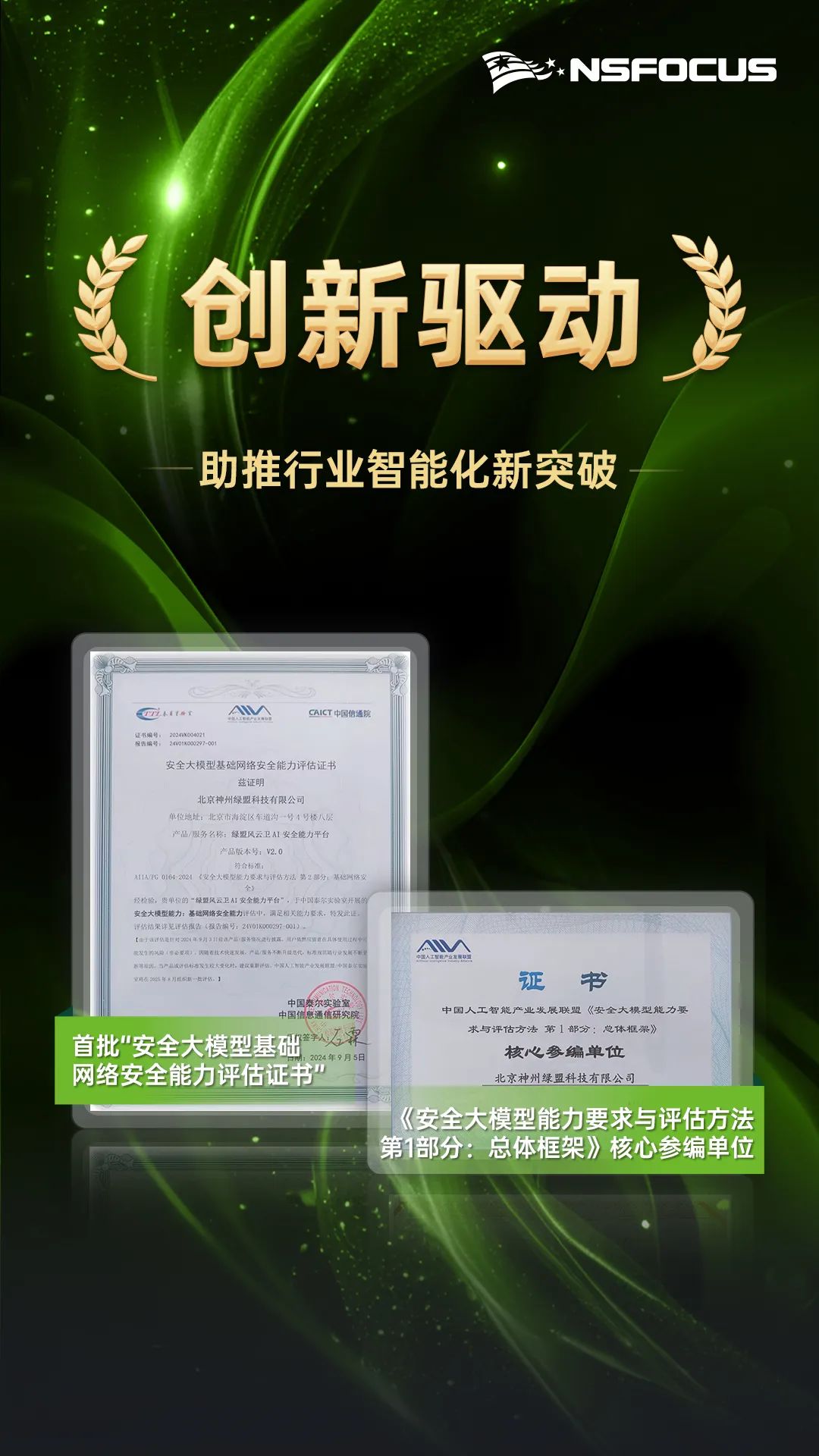 会上,首批“安全大模型基础网络安全能力评估证书”正式颁发,绿盟科技凭借技术实力成功入选,成为首批获证的七家网络安全厂商之一。同时,绿盟科技获授中国人工智能产业发展联盟《安全大模型能力要求与评估方法第1部分:总体框架》核心参编单位,进一步彰显了其在行业中的深度贡献。