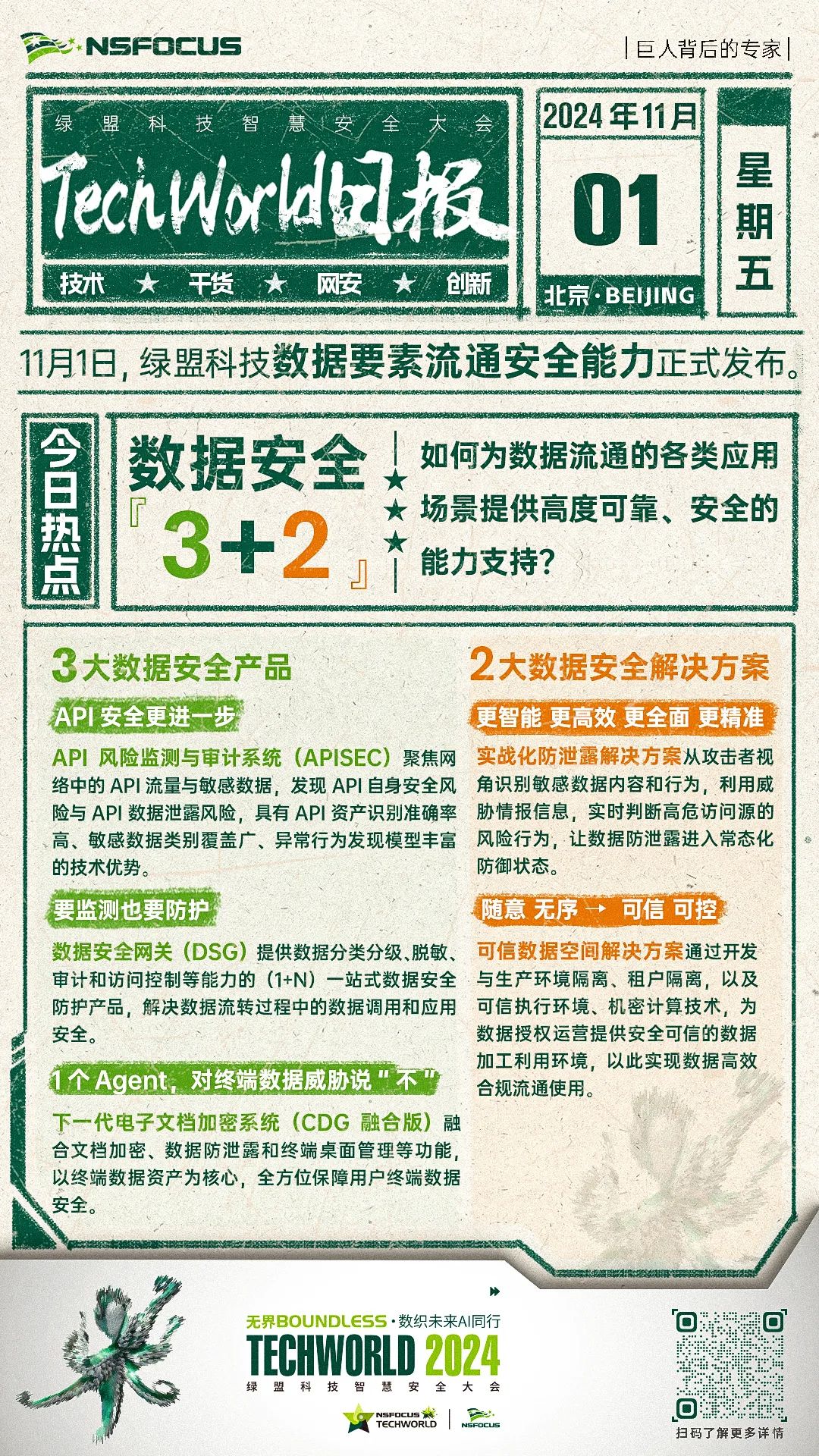 数字化浪潮方兴未艾,人工智能与网络安全的深度融合正在重塑现代安全格局。11月1日,2024 绿盟科技TechWorld智慧安全大会在北京召开。会上,绿盟科技在数据安全领域围绕数据要素流通安全能力进行发布,包括API风险监测与审计系统(APISEC)、数据安全网关(DSG)、下一代电子文档加密系统(CDG融合版)在内的三款数据安全产品和实战化防泄露解决方案、可信数据空间解决方案两套方案,旨在持续为数据流通的各类应用场景提供高度可靠、安全的数据安全支持。